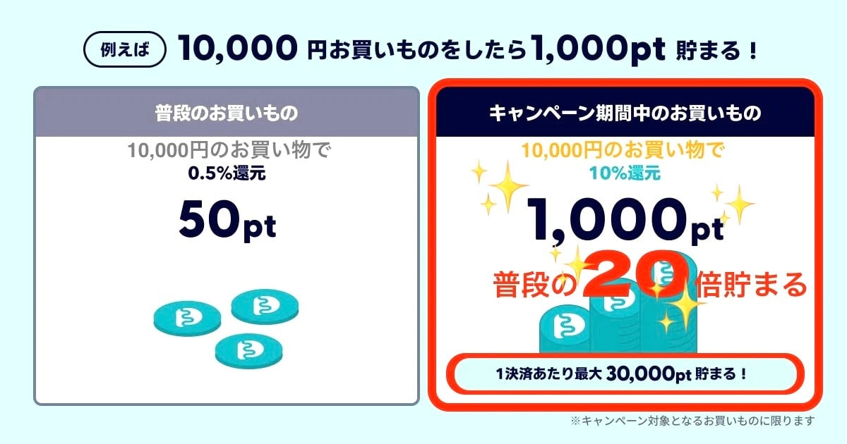 期間中に、対象の決済方法でお買いものすると、「Pay ID ポイント」を10%(上限:1決済あたり30,000ポイント)還元する、「Pay ID ポイント大還元祭」を開催します。